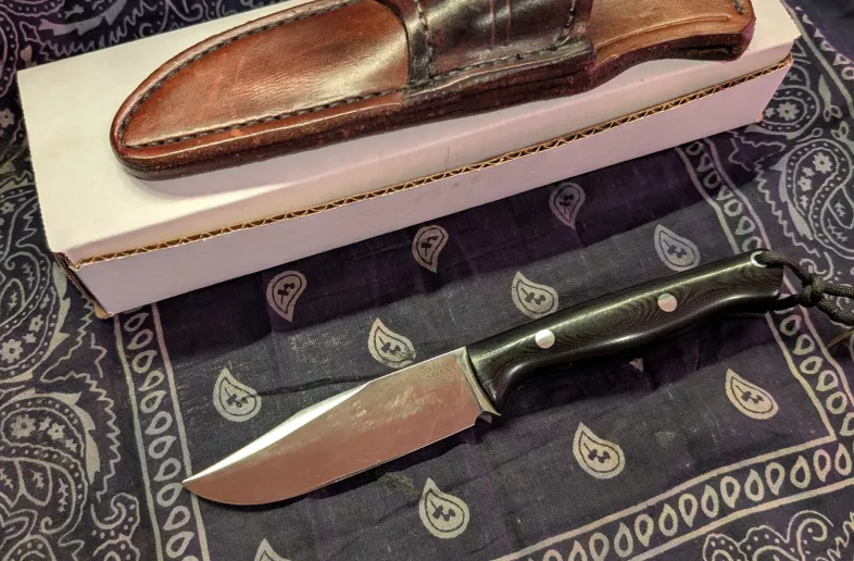 Bark River Sidekick Magnacut. Black G10. slight mirror polish on logo side for feather sticking and woodcarving. Very comfortable, will fit various hand sizes. box and ac essories. Shipping on buyer.