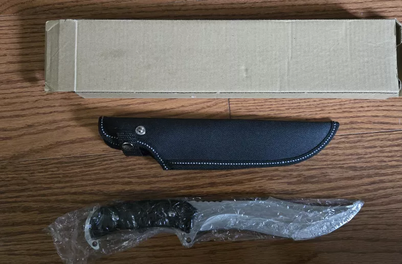 Comes in the original box, holder and plastic packaging. Still brand new and has not been removed from its plastic covering, (removed from holder to photo it). Highly sharp and is a full metal construction with a rope handle.