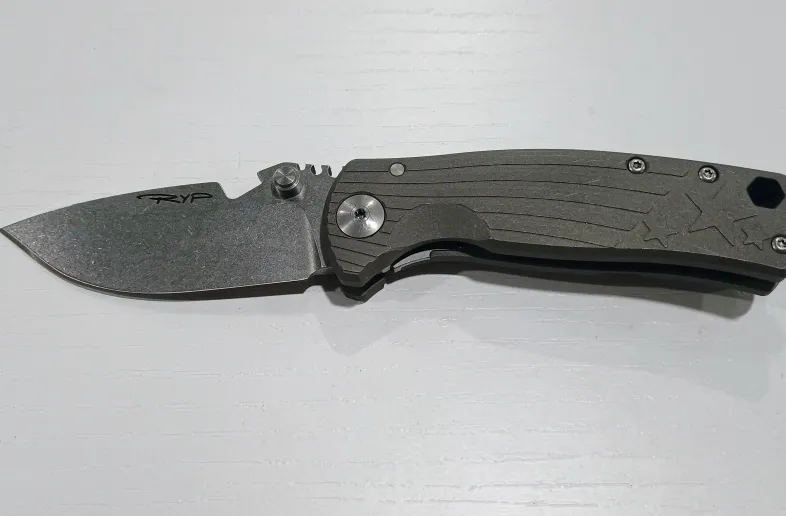 Stainless steel caged bearing pivot hardware. Nice "snappy" action and solid lockup-- Well centered. American aerospace grade 6Al4v titanium frame and handles with Stars and Stripes pattern in stonewash finish.