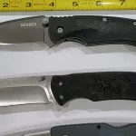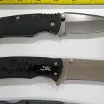 2) Browning Large Primal Liner Lock--Stainless steel 8Cr13 Blade with Rubber Handle and short deep carry pocket clip. Dual thumbstuds and flipper tab (doesn't flip without wrist action). Nice action with thumbstuds.