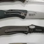 4) CRKT Pazota Linerlock--2 3/4" spear point half serrated blade--titanium nitride coated--Sharp! OAL 6 1/2", Closed 3/ 3/4". Frame lock, Stainless Scales. Tip down pocket clip. Nice used condition ($SOLD).