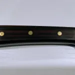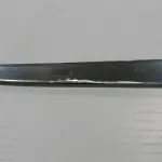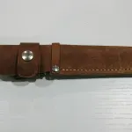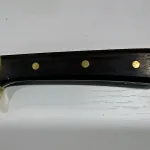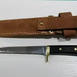 Hand made unmarked fillet knife. Hollow ground mirror polish blade with clean very sharp edge. Wood (Walnut?) handle-no chips or cracks-- with brass guard, pins and lined lanyard hole. Full tang construction. Comes with hand made leather sheath--bit of a loose fit as knife can be removed with opening snap. Nice used condition--has sharpening scratches and minor bolster scuffs. Blade 6 5/8" , OAL 11/ 3/8". Will ship at buyer expense ($25 tracked Canada Post).