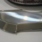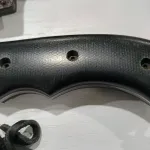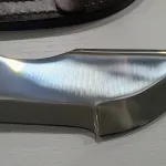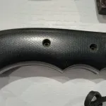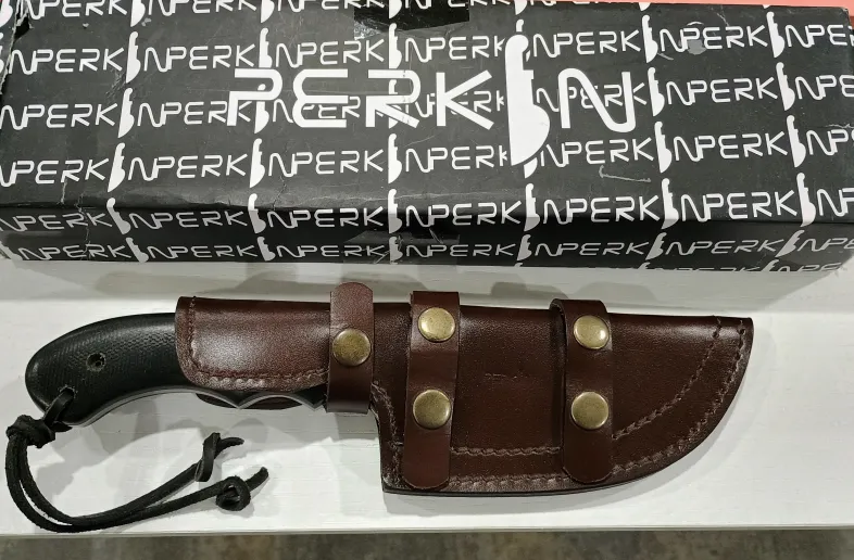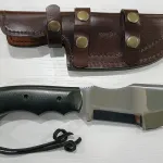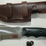 Large complex ground drop point blade--Factory edge. Comfortable finger grooved Micarta handle with lanyard hole. Comes with a nice brown leather sheath. Excellent new condition.