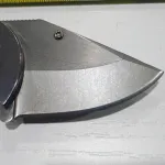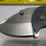 Stonewash finish, Hollow ground, clip point, plain edge blade with textured thumb stud. Blue titanium frame with water jet cut swirls on the front and tumble finish on the lock side, tumbled stainless steel deep ride clip, tip up carry. Bronze bushings--smooth open, solid lockup and nice detent. Blade 1 7/8", Closed 2 7/8 ", OAL 4 1/2". Made in USA. Excellent used condition--see pics. Will ship at buyer expense ($22 Tracked Canada Post).