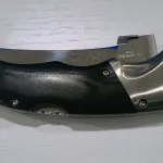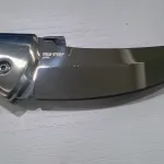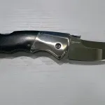 VG-1 San Mai III Mirror Polished Blade with removable thumb plate. Titanium frame with black Linen Micarta Handles with Polished S.S. Bolsters. Blade 3 3/4", Closed 5 7/8", OAL 9 3/4". NOTE: Missing Pocket Clips (has backplate and screws.)