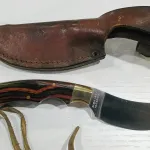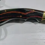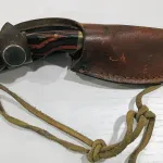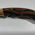 Full tang construction with a multi-colored "Dymondwood" laminated wood handle with Brass pins and lined lanyard hole. Blade 3 ", OAL 6 7/8". Comes with original leather sheath--could use some conditioner--getting stiff at end of belt loop.
