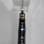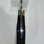 Hi polished unique style stainless blade with clean sharp factory edge. 3/16" thick at spine.