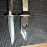 - Rick "Bear Bones" Smith (Rogue River Oregon) custom hand made Bowie. Antler handle, quality leather sheath handmade buy Old Peublo in Tuscon, AZ. Beautiful piece. OAL 12.75", blade 8". $500 now $450 shipped. 2nd from right in pic 1, left in pic 2.