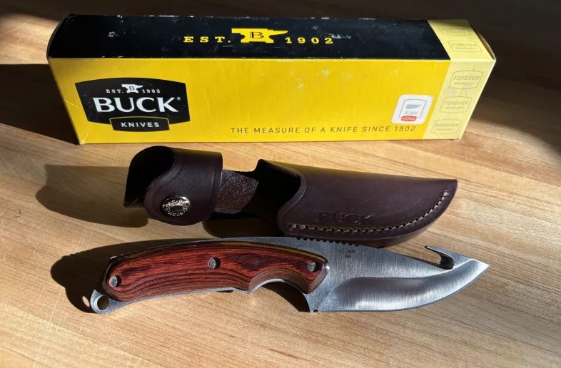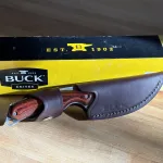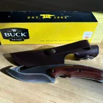 New in box Buck Knife, with S30V blade. Rosewood handle and genuine leather sheath. This is a beautiful knife.
