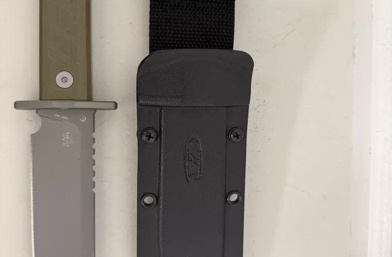 - Kydex sheath with secondary retention strap for travel; includes slots, drainage hole, and can be carried left- or right-handed, high or low carry