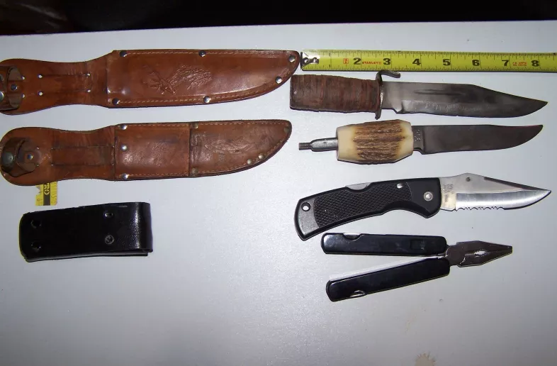 1 BOWIE, 1 SOLINGEN ANTLER HANDLED, BOTH NEED REPAIRS, MULTI TOOL, AND ONE FOLDING, WITH VINTAGE SHEATHS, REDUCED TO FINAL FINAL $40.00 PORCH PICK UP ONLY, WELLAND ONTARIO, CASH ONLY