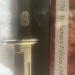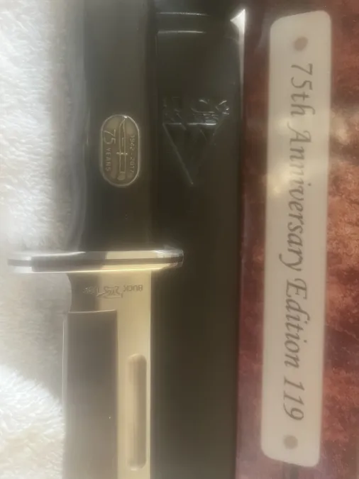 Buck 119-Cabela’s 75th Anniversary Edition/Metal Box plus leather sheath/Certificate of Authenticity paper /75th Anniversary Metal Ingot inset in black phenolic handle -$160.00