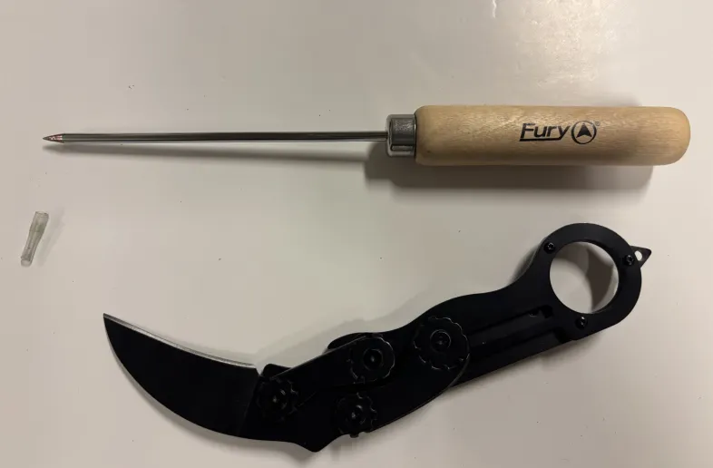 Fury icepick, tempered steel honed to a perfect tip, folding kerambits.