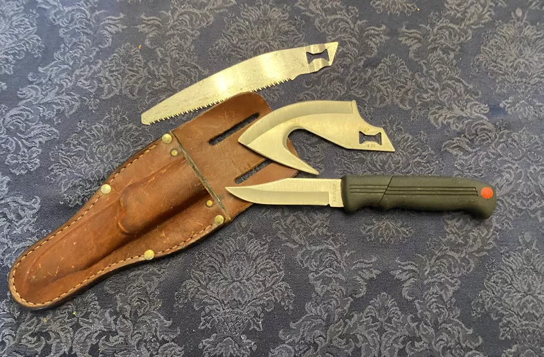 Am reducing the herd a bit. Hunting Knife, Gut Hook, Saw and Leather Sheath. Three stainless steel blades, black copolymer handle accepts all three.