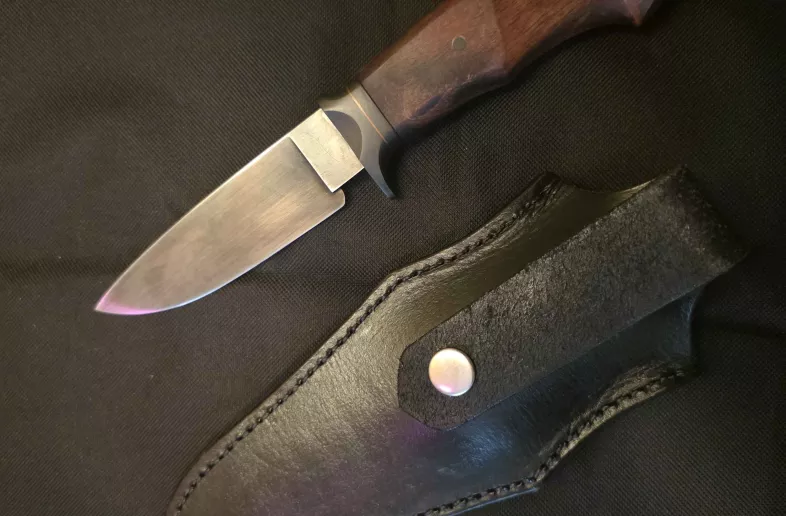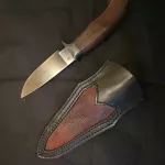 For sale is a scarce custom fixed blade knife by skilled Brazilian knifemaker Phil Oliveira, looking for $230 shipped. The 4.5” blade is made of 1070 steel with a satin black oxide finish, and it has a guard made of 1020 steel with a copper inlay and phosphate finish. I believe the handle on this one is made of Jacaranda wood with a fiber pin, and the knife has an overall length of 9.45”. It comes with a nice leather pancake sheath as well. I am not the first owner but the knife is in phenomenal shape, I’ve never cut anything with it and I can’t see any signs of use. I would give it a 9.5/10 as far as condition goes. If you have any questions please don’t hesitate to get in touch with me.