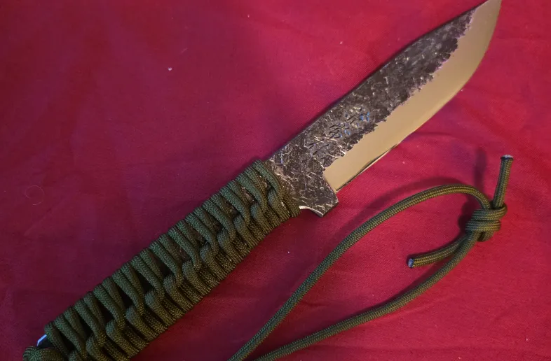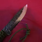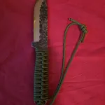 For sale is a Japanese-made Seki Kanetsune 'Karasu' outdoor utility/survival knife in Aogami #2 blue carbon laminate damascus steel. Comes with a green paracord wrapped grip. Looking for $250 shipped or reasonable offer. The blade length is 4.9" with a 5.5" full tang handle. Comes with a nylon sheath. Brand new, never cut anything with it. Only took it out of the sheath a couple times to admire it. An absolutely gorgeous blade.