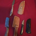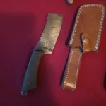 - Bottom left: A small cleaver with plain wood handles, one side has an imperfect decorative mosiac pin. Leather sheath. Price is $80 shipped.