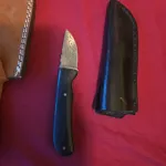 - Bottom right: A small utility knife with decorative jimping on the back of the blade and bison horn handles as well as a black leather sheath. Price is $125 shipped.