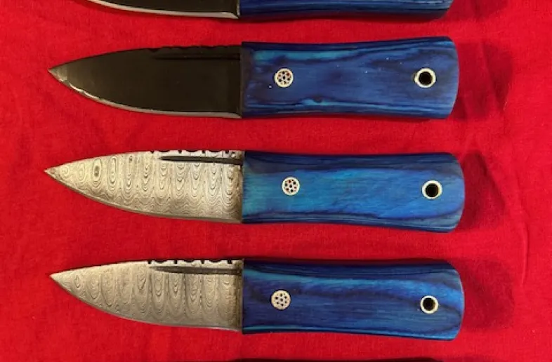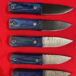 2 are 440 STS Blackened and 3 Damascus . All have leather sheath.