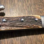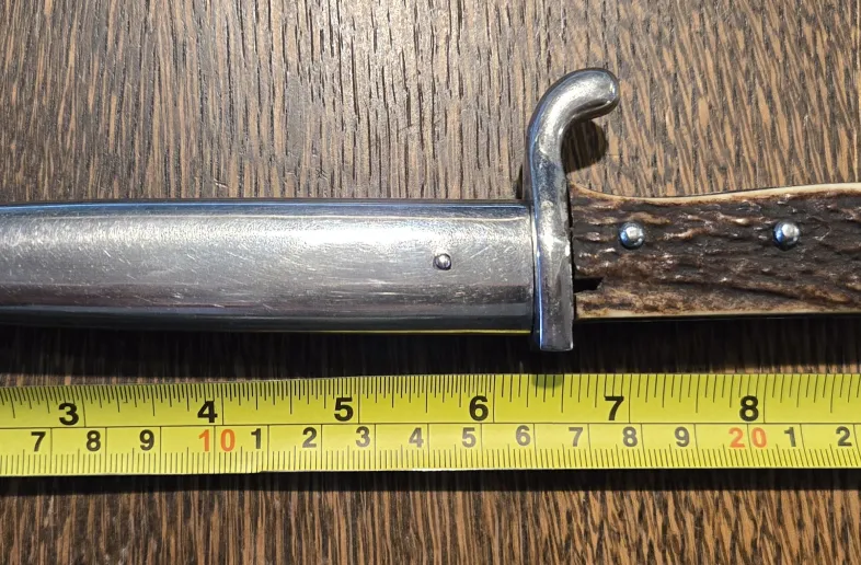 This is an authentic WWI trench fighting knife by the premier maker, WKC Solingen. The eagle's head pommel is made to resemble a bayonet, but this was made as a boot or belt knife. This is an early-war example with stag grips. Later versions had grips made from composite material. Some evidence of sharpening to the blade but otherwise in excellent condition.