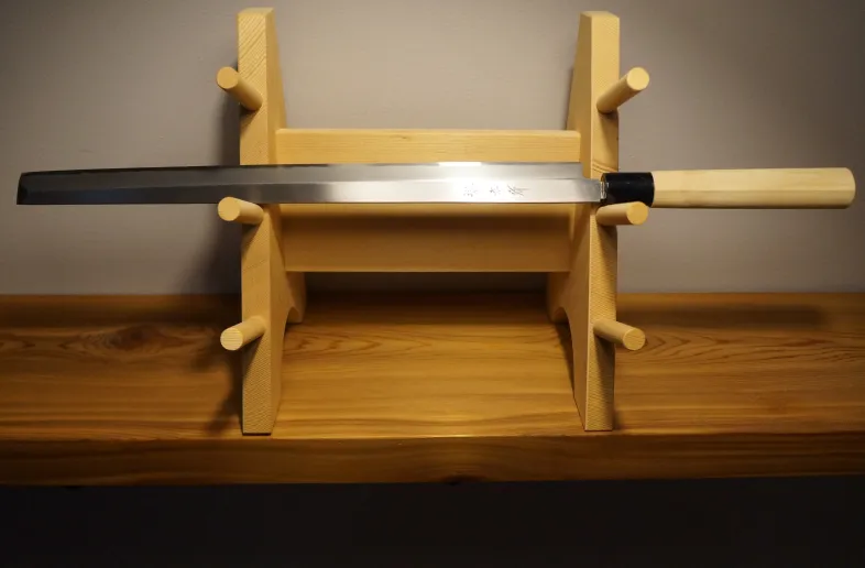 The SAKAI TAKAYUKI brand of Japanese knives are world renowned for there blend of performance and elegance. This knife blade measures 36mm/14" and is a masterpiece. Used primary by professional chiefs for cutting raw fish, octopus and other boneless seafood. This knife is RAZOR sharp and 100% MADE IN JAPAN.