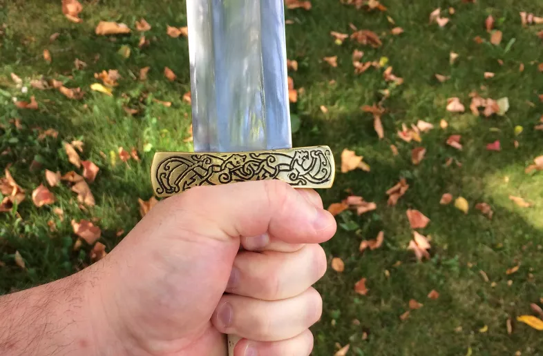Petersen type R hilt with hand engraved Scandinavian knot work based off an 10th century find currently housed at the Viking Museum Haithabu in Busdorf Germany. Blade is an Oakeshott type 10 Geibig variant 4 typology.
