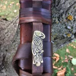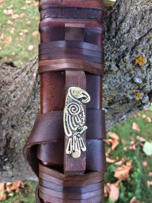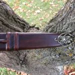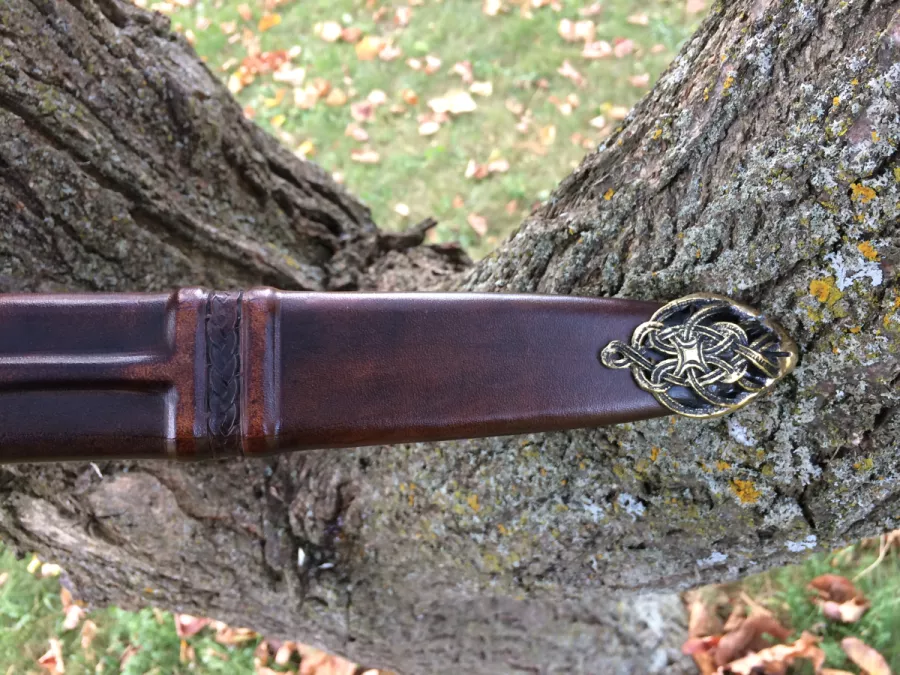 scabbard is wood lined, leather wrapped with belt and custom chape, belt fittings, and bridge accent.
