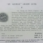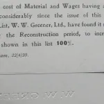 18 pages. Gilt covers, lavender string binding, illustrated with photographs, small crease on the rear cover. see photos. Rare original Greener catalog, tipped in announcement to the rear of the front cover. "The cost of materials and wages having advanced very considerably since the issue of this Pre-war price list, W W Greener have found it necessary during the reconstruction period, to increase the prices shown in this list 100%. Birmingham, 22/4/20" Illustrated with photographs of the high end grades, L90, FT90, G60, G90, interior lock mechanism of a sidelock ejector gun, Best Hammer Gun Decorated, Embossed Gold, St. George and Royal grades. Greener gun Cases. Price includes mailing anywhere.