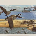 Offering a vintage collection of 12 prints - Remington Arms 150th Anniversary Portfolio 1816 – 1966. From Remington on the inner cover: The 12 prints in this portfolio were specially prepared to commemorate our 150th Anniversary. Design concepts for all paintings were carefully examined for their historical significance by the artists commissioned to do this work. Robert Kuhn, selected for his acknowledged ability as one of the world's finest wildlife illustrators, and James Laing, for his excellence in portraying antique guns in authentic settings. We hope that, through this collection of prints, you will share with us some of the great moments in which Remington guns have furthered growth in the shooting sports during the past 150 years. The prints depict vintage Remington rifles as well as hunting scenes. Each Print measures approx. 16 "” x 12 ¼”. This complete set includes the original portfolio sleeve, cardboard backer and mailing envelope. All prints are very clean and nice.