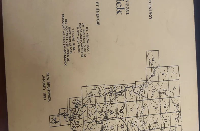 For sale, one 1991copy, in very good condition, issued by New Brunswick’s DNR, an interesting book of road maps showing roads and power lines in the province.