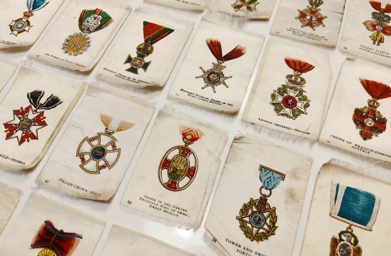 Here are (37) early-century tobacco silks, from an estate .... insert premiums inside cigarette packages from 1910-1912 ... depicting historical military medals from various countries.