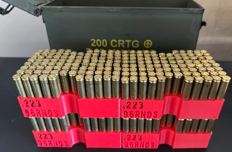 4 trays fit in a 30cal ammo can for a total of 4x96 rounds (384 rounds) well stored in your 30cal can.