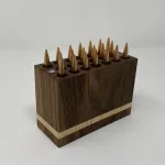 Premium walnut and make ammo box in 7mm rem mags (other sizes available). Prefect for displaying your cartridges taking the out to the range. The box won’t damage your bullet tips