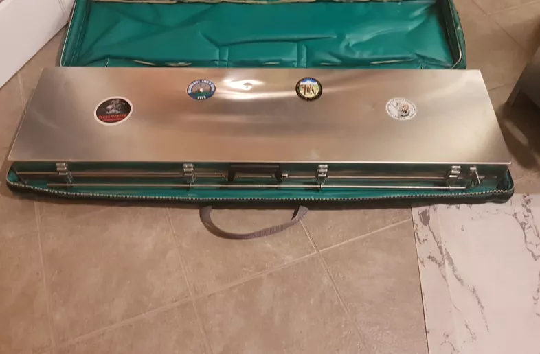 This custom-built case (for an auction item donated by Cabela's, years ago) was made by Kalispell case line. It is 53.5"x15.5"x5" (2.5" Top section and 2.5" Bottom section) (LxWxH)