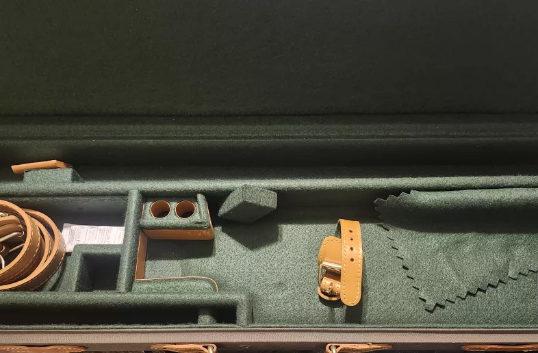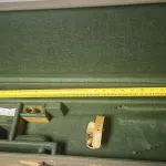 Vintage break down case with a canvas finish and leather trim. This is unused, and has been in storage for quite some time. Fit up to 32" barrels without chokes installed. In almost as new condition, with very minor imperfections on the metal due to age.