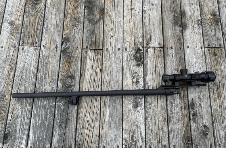 Excellent condition Mossberg 20ga rifled slug barrel. 24" length with a 3" chamber, cantilever scope base, 1" rings and a Dead Ringer 2.5 x 20 shotgun scope. Scope has a standard duplex reticle and offers 8.5" of extended eye relief so you aren't gonna punch yourself in the forehead with this one.