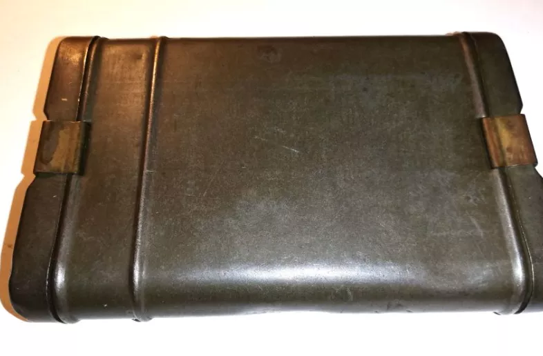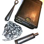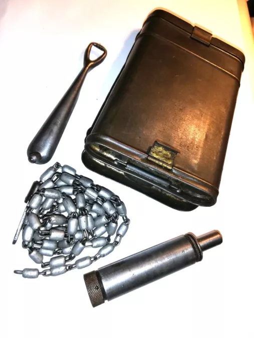 The set includes the storage tin, steel oiler bottle, aluminum chained pull thru and brushes