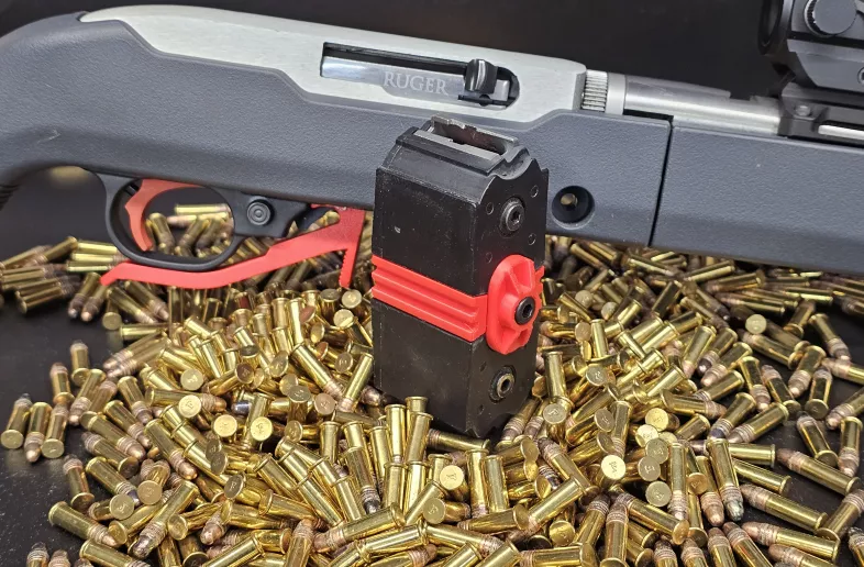 BX-1 magazine coupler for 10/22 rifle, SR-22 rifle, 22 Charger pistol, .22LR Ruger American Rimfire rifle, .22LR Ruger Precision Rimfire rifle, .22LR Ruger 77/22 rifle, and TUF22. Also fits Adler RF-224. Printed in ABS with heat-set metal threads and all hardware included. No glue required.
