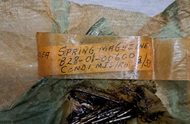 New old stock, USGI M1 Carbine magazine springs x10. Wrapped in wax paper and cosmoline. Date tag shows 1953 !!!Smells like it too, haha.