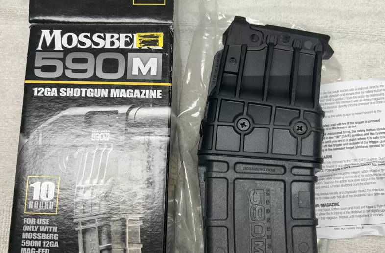 Mossberg 590 M or RM 12 ga , 10 round mag. Compatible with both the M and RM, according to Mossberg web site and confirmed it fits a RM. Retails for $192 plus tax, but most are sold out currently. Will sell for $200 plus shipping, but prefer to trade for 5 rd mag to fit same 12 ga.