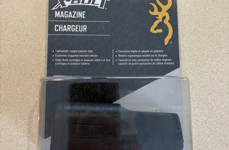 New Browning X-Bolt Long Magnum clip magazine product code 112044601 for 338 300 and 7mm magnums. 100$ delivery available within Northeastern Ontario. Shipping within Canada available for 10$ more. Text 705-507-7477