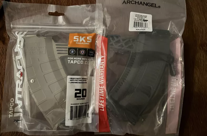 2. Archangel SKS magazine with lever release, 5/20 black one, $55 each.