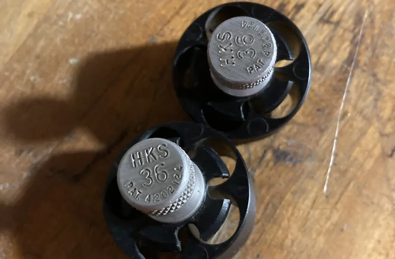 HKS 36 Revolver speedloaders for Caliber .38/357. Fits S&W 36, 37, 38, 40, 42, 49, 60, 340, 360. Taurus, Rossi 68, Ruger SP101. 5 Bullet speedloaders.