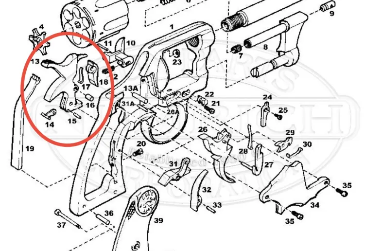 Looking for a complete hammer assembly for an 1892 Colt DA revolver including stirrup, spur w/ spring. Refer to circled area in attached picture.