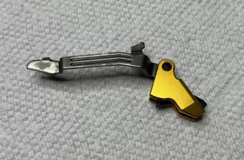Up for sale is a Glock 48/43X Aluminum gold trigger shoe w/ OEM trigger bar in excellent condition. This would make a great addition to any exotic G48/43X build. It functions perfectly with OEM connector, sear housing and striker assembly. For detailed condition of the trigger please see the photos attached. I can always take more photos if you are interested.