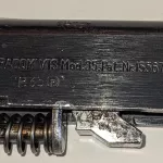 Original WW2 production Radom P35 complete slide and original FB Radom balelite grips and screws. . Barrel and recoil spring assembly. All internal parts. Slide has original markings, see photo. Slide has finish wear as pictured. Slide functions on frame.