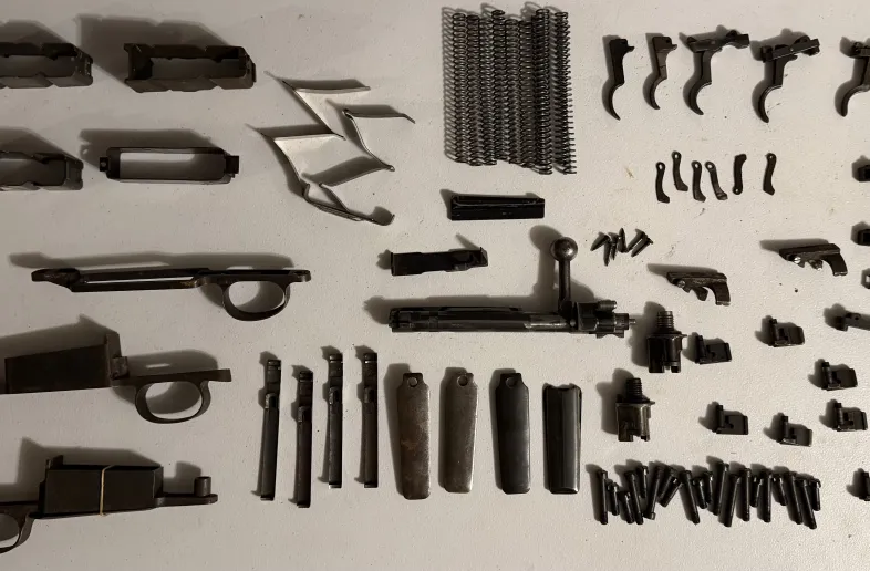Complete bolt stops, complete trigger with sear, compete bolt assembly, trigger guard, followers, springs, screws, etc.
