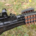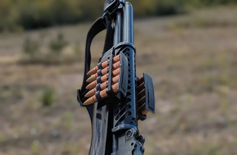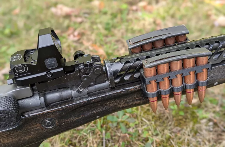 Faster reloads and a convenient way to carry more stripper clips, this "side saddle" can hold a single "shorty" 5-round stripper clip (Oh, Canada!) or a whole 10-round clip. Rounds easily slide in and out of the saddle yet will not fall out when shaken vigorously.