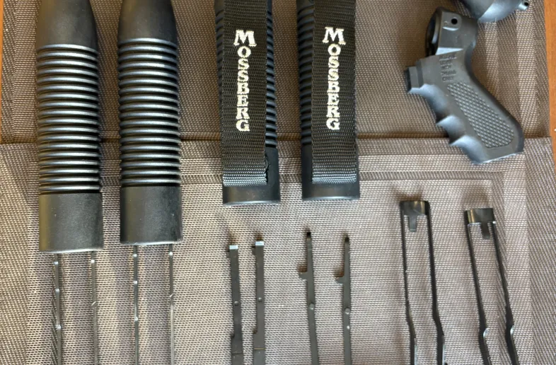 NO TRADES PLEASE. These components are all from test fired only Maverick 88 12 gauge guns except for the raptor grip and Mossberg logo fore ends which were from 590 Shockwaves. Most components will interchange between models 88/500/590 with some exceptions.