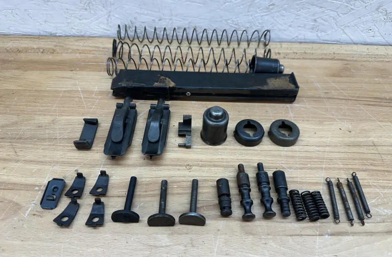 Various Sten parts . Springs, plungers , bolt handles , spring retainers, mag loaders, mag well parts, original magazine.